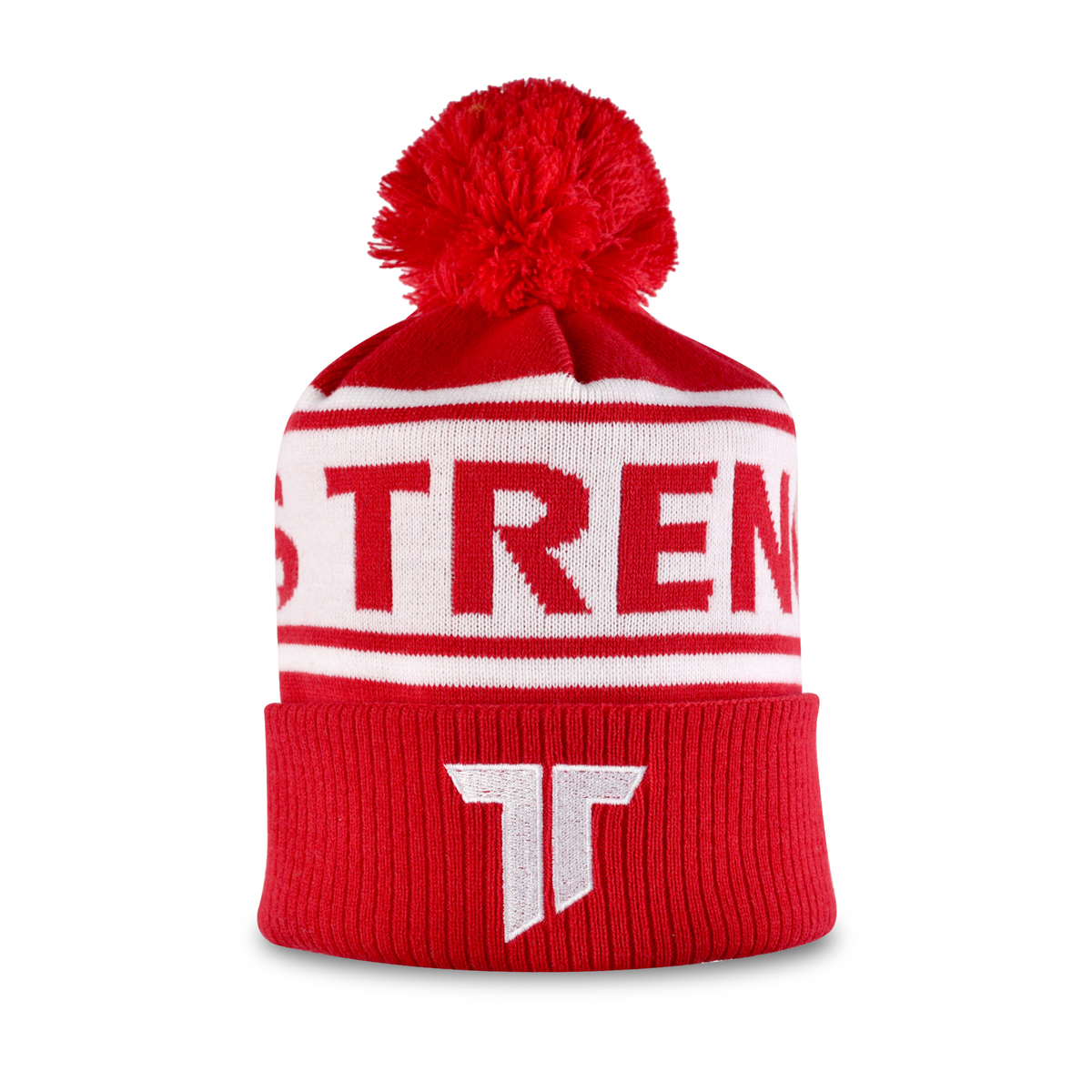 Červená pletená čiapka AS Trenčín s brmbolcom a výšivkou loga AS Trenčín.